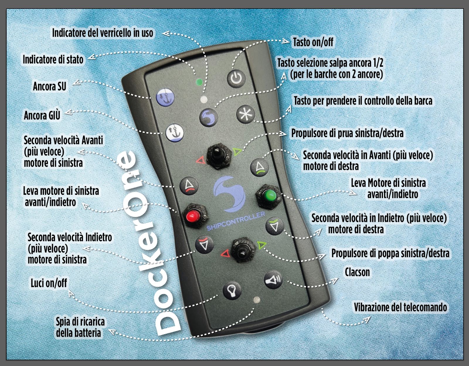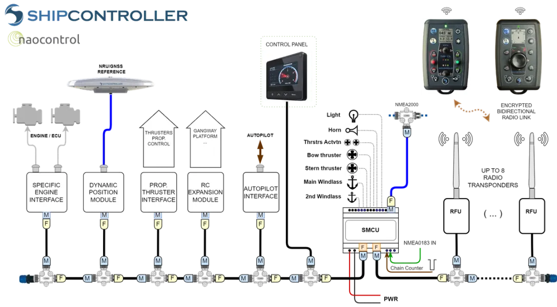 Il requisito essenziale per il controllo remoto delle imbarcazioni a motore è la capacità di gestire i sistemi di propulsione della nave (motori e propulsori), oltre a funzioni secondarie come il verricello o la sirena dell'imbarcazione. Inoltre, per le sue funzionalità più avanzate, Shipcontroller deve connettersi ad altri sistemi di bordo, come le reti di dati di navigazione.